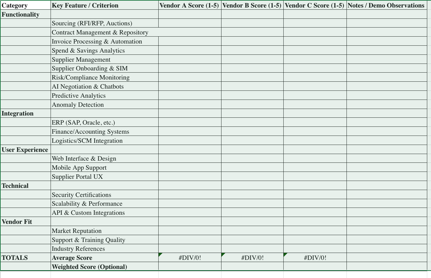 A standard enterprise-grade procurement platform should cover: